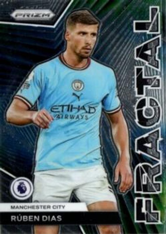 The Ruben Dias 2022 Prizm Premier League #1 Fractal card is 1 of 50 Ruben Dias' card variations in the 2022 Prizm Premier League set being tracked by Sports Card Investor, including Base, Breakaway, Choice Blue Yellow Green, Green Ice, and Green Pulsar.