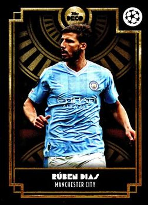 The Ruben Dias 2023 Topps Deco UEFA Club Competitions Current Stars card is 1 of 14 Ruben Dias' card variations in the 2023 Topps Deco UEFA Club Competitions set being tracked by Sports Card Investor, including Current Stars Autographs, Current Stars Autographs - Green /99, Current Stars - Green /99, Current Stars Autographs - Blue /49, and Current Stars - Blue /49.