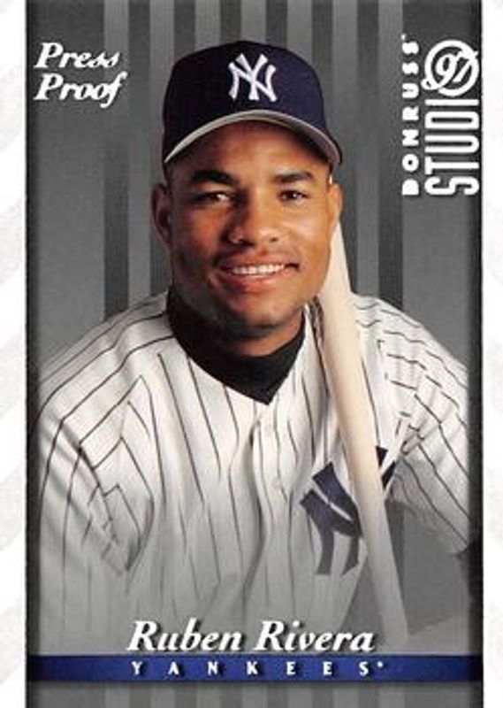 The Ruben Rivera 1997 Donruss Studio #158 Press Proof Silver card is 1 of 3 Ruben Rivera's card variations in the 1997 Donruss Studio set being tracked by Sports Card Investor, including Base, and Press Proof Gold.