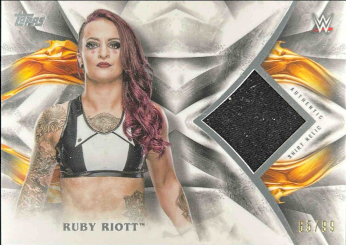 The Ruby Riott 2019 Topps WWE Undisputed #UR-RB Undisputed Relic /99 card is 1 of 23 Ruby Riott's card variations in the 2019 Topps WWE Undisputed set being tracked by Sports Card Investor, including Base, Orange /99, Green /50, Blue /25, and Gold /10.
