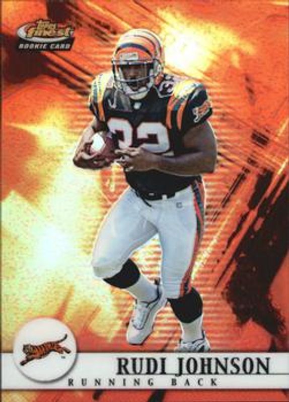 The Rudi Johnson 2001 Topps Finest #114 Base Rookie card is 1 of 2 Rudi Johnson's card variations in the 2001 Topps Finest set being tracked by Sports Card Investor, including Rookie Premiere Jerseys.