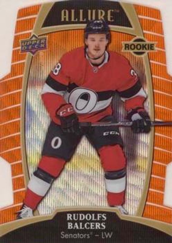 The Rudolfs Balcers 2019 Upper Deck Allure #82 Orange Slice /199 Rookie card is 1 of 40 Rudolfs Balcers' card variations in the 2019 Upper Deck Allure set being tracked by Sports Card Investor, including #111 Base, #82 Base, #82 Pewter, #111 Pink Diamond, and #82 Red Rainbow.