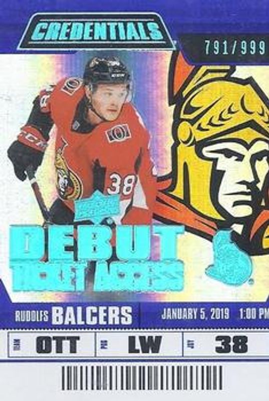The Rudolfs Balcers 2019 Upper Deck Credentials #85 Base /699 Rookie card is 1 of 5 Rudolfs Balcers' card variations in the 2019 Upper Deck Credentials set being tracked by Sports Card Investor, including Red /99, Green /25, Purple /10, and Black /1.