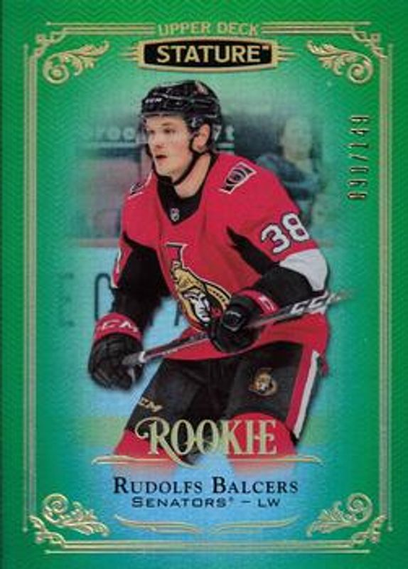 The Rudolfs Balcers 2019 Upper Deck Stature #191 Green /149 Rookie card is 1 of 25 Rudolfs Balcers' card variations in the 2019 Upper Deck Stature set being tracked by Sports Card Investor, including Base /399, Autographs /199, Autographs Green /85, Portrait Variant /85, and Red /75.