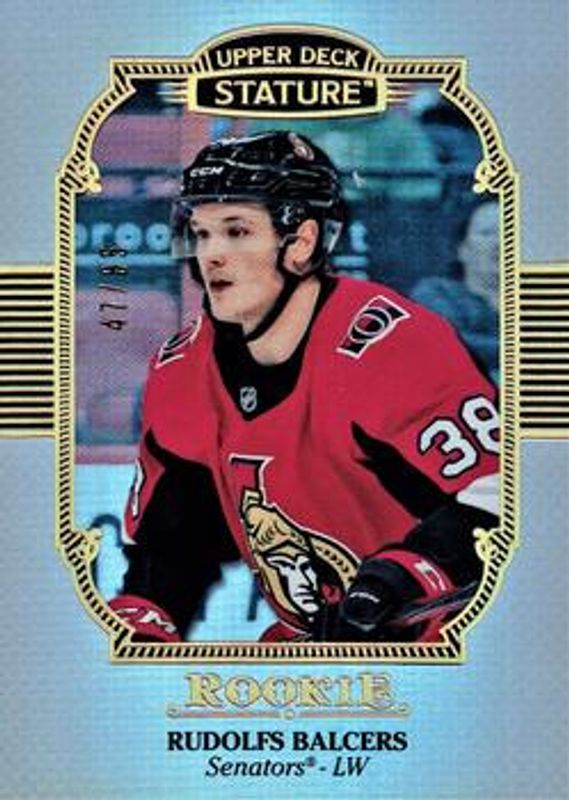 The Rudolfs Balcers 2019 Upper Deck Stature #191 Portrait Variant /85 Rookie card is 1 of 25 Rudolfs Balcers' card variations in the 2019 Upper Deck Stature set being tracked by Sports Card Investor, including Base /399, Autographs /199, Green /149, Autographs Green /85, and Red /75.