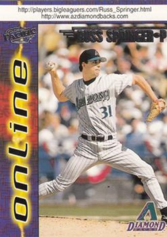 The Russ Springer 1998 Pacific Online #46 Base card is 1 of 4 Russ Springer's card variations in the 1998 Pacific Online set being tracked by Sports Card Investor, including Base Winners, Red, and Web Cards.
