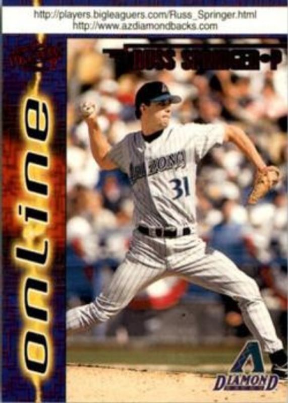 The Russ Springer 1998 Pacific Online #46 Red card is 1 of 4 Russ Springer's card variations in the 1998 Pacific Online set being tracked by Sports Card Investor, including Base, Base Winners, and Web Cards.