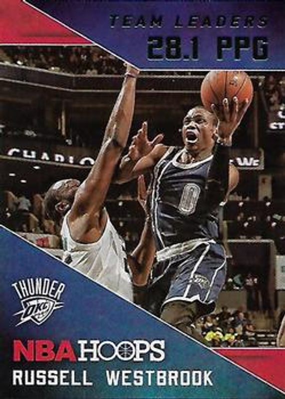 The Russell Westbrook 2015 Hoops #9 Team Leaders card is 1 of 33 Russell Westbrook's card variations in the 2015 Hoops set being tracked by Sports Card Investor, including Base, Gold, Green, Red Back, and Blue /399.