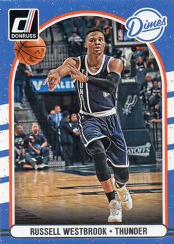The Russell Westbrook 2016 Donruss #5 Dimes card is 1 of 37 Russell Westbrook's card variations in the 2016 Donruss set being tracked by Sports Card Investor, including Base, Green & Yellow Holo Laser, Orange Holo Laser, Press Proof Silver /299, and Press Proof Purple /199.