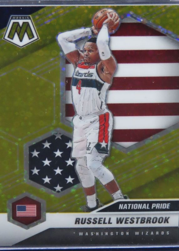 The Russell Westbrook 2020 Mosaic #253 National Pride - Fast Break Gold /10 card in Raw condition has not changed in price in the last 30 days and was last sold for $37.00 .