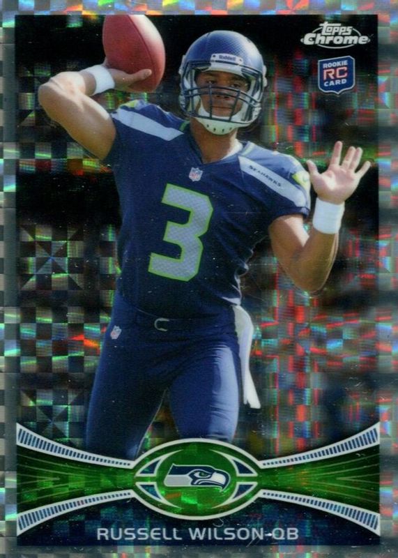 Russell Wilson's Football cards are available in at least 110 sets. Russell Wilson's biggest 7-day price movers are 2012 Topps Chrome #40 X-Fractor, 2012 Topps #165 Base, and 2022 Mosaic #GM-8 Glass Mosaic /(SSP).