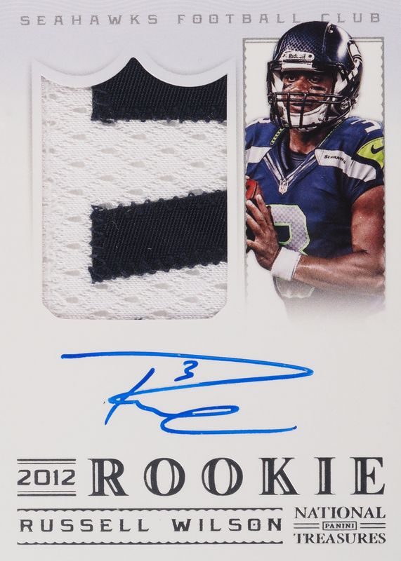 This card is 1 of 5 Russell Wilson's card variations in the 2012 National Treasures set being tracked by Sports Card Investor, including Rookie Patch Auto - Gold /49, Rookie Patch Auto - Black /25, Rookie Patch Auto - Platinum /5, and Rookie Patch Auto - Red NFL Shield /1.