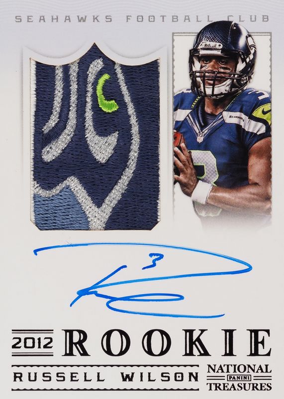 This card is 1 of 5 Russell Wilson's card variations in the 2012 National Treasures set being tracked by Sports Card Investor, including Rookie Patch Auto /99, Rookie Patch Auto - Gold /49, Rookie Patch Auto - Platinum /5, and Rookie Patch Auto - Red NFL Shield /1.
