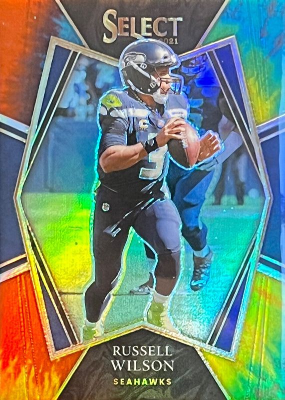This card is 1 of 49 Russell Wilson's card variations in the 2021 Select set being tracked by Sports Card Investor, including Premier Level Silver, Premier Level Silver Die-Cut, Premier Level Neon Green Die-Cut /349, Premier Level Orange Die-Cut /249, and Premier Level Copper Die-Cut /199.