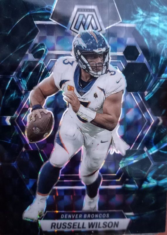 This card is 1 of 14 Russell Wilson's card variations in the 2023 Mosaic set being tracked by Sports Card Investor, including Choice Peacock /(SSP), Honeycomb /(SSP), Red Sparkle /(SSP), White Sparkle /(SSP), and Green Fluorescent /10.