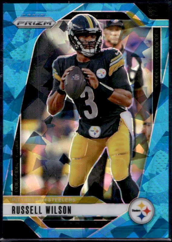 The Russell Wilson 2024 Prizm #240 Blue Ice /99 card is 1 of 84 Russell Wilson's card variations in the 2024 Prizm set being tracked by Sports Card Investor, including Base, Choice Blue Yellow Green, Choice Silver, Disco, and Green.