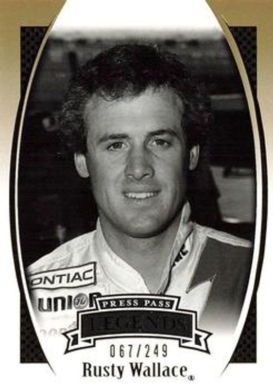 The Rusty Wallace 2007 Press Pass Legends #G-32 Gold /249 card is 1 of 29 Rusty Wallace's card variations in the 2007 Press Pass Legends set being tracked by Sports Card Investor, including Base, Solo, Blue /999, Bronze /599, and Holofoil /99.
