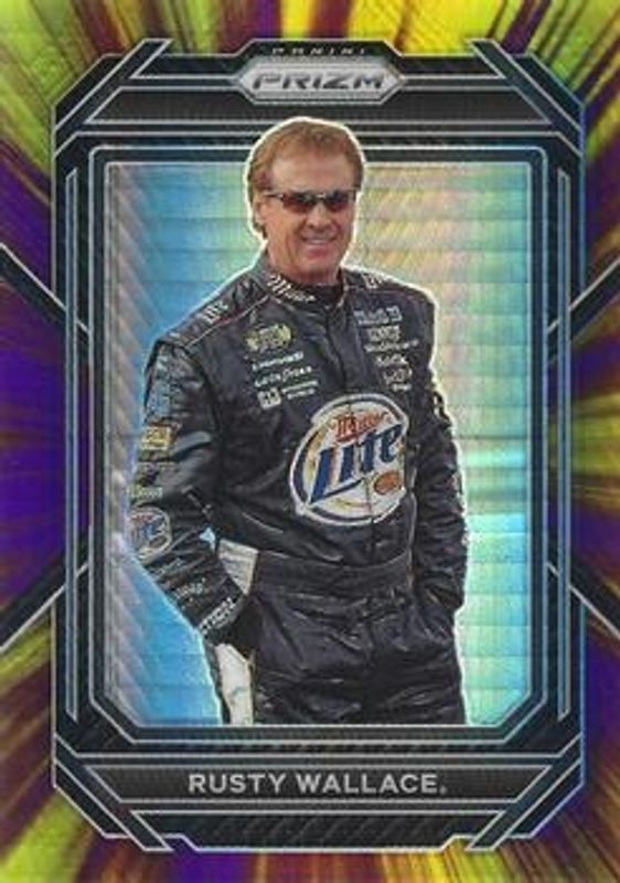 The Rusty Wallace 2023 Prizm NASCAR #4 Hyper Purple & Yellow card is 1 of 55 Rusty Wallace's card variations in the 2023 Prizm NASCAR set being tracked by Sports Card Investor, including Base, Hyper Blue & Carolina Blue, Reactive Orange, Red, and Silver.