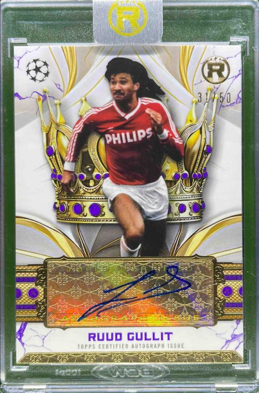 The Ruud Gullit 2024 Topps Reverence UEFA Club Competitions #CLA-RU Crowned Legend Autographs - Purple /50 card is 1 of 31 Ruud Gullit's card variations in the 2024 Topps Reverence UEFA Club Competitions set being tracked by Sports Card Investor, including Base, Green /99, Blue /75, Purple /50, and Orange /25.