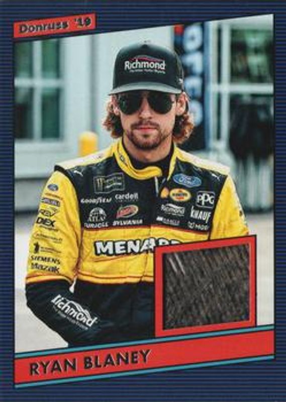 The Ryan Blaney 2019 Donruss NASCAR #86-RB 1986 Retro Relics card is 1 of 76 Ryan Blaney's card variations in the 2019 Donruss NASCAR set being tracked by Sports Card Investor, including #97 Base, #109a Silver, #109b Silver, #54 Gold /299, and #97 Gold /299.