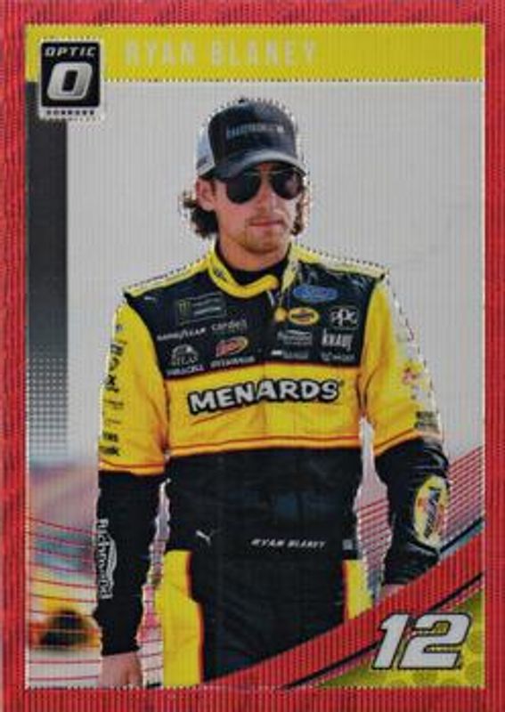 The Ryan Blaney 2019 Donruss NASCAR #25 Optic Red Wave card is 1 of 76 Ryan Blaney's card variations in the 2019 Donruss NASCAR set being tracked by Sports Card Investor, including #97 Base, #109a Silver, #109b Silver, #54 Gold /299, and #97 Gold /299.