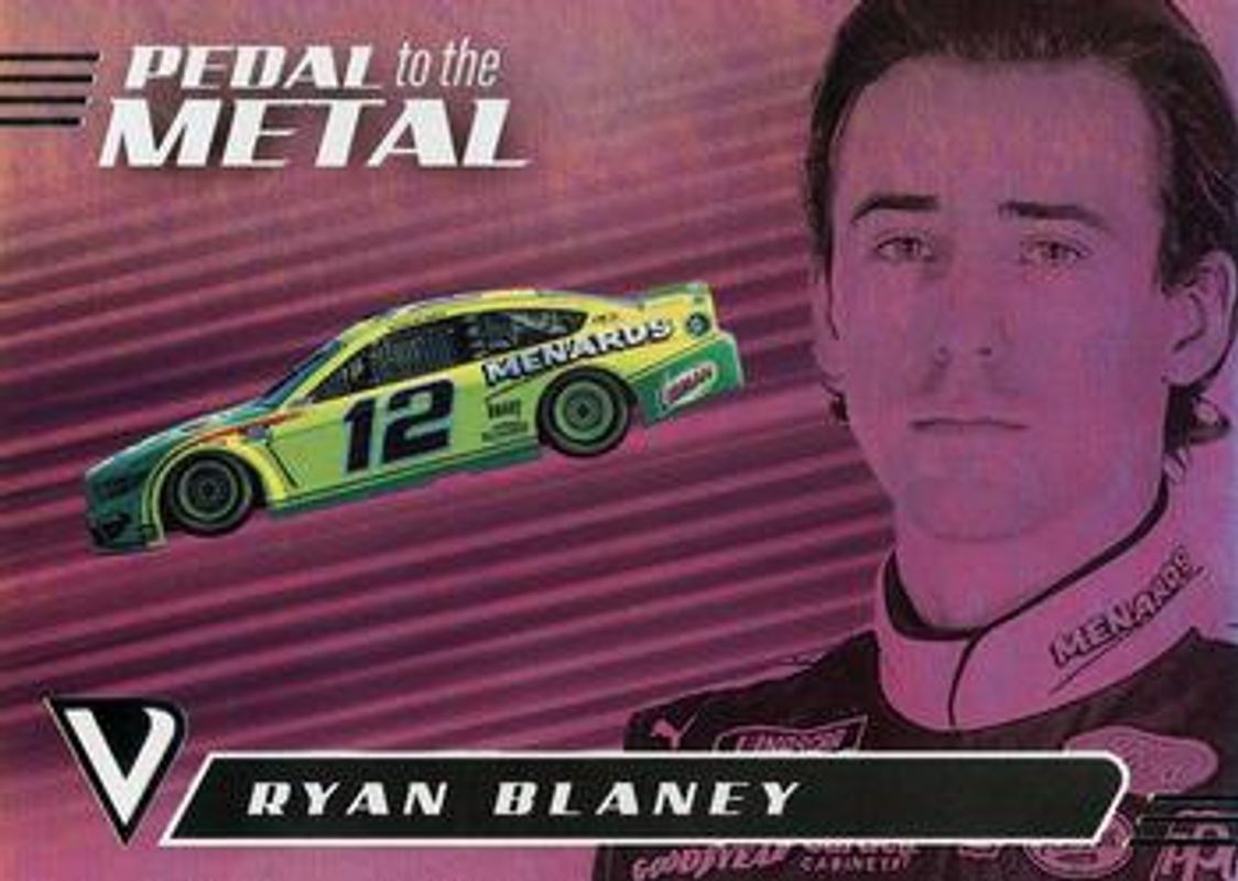 The Ryan Blaney 2021 Chronicles NASCAR #9 Pedal to the Metal card is 1 of 120 Ryan Blaney's card variations in the 2021 Chronicles NASCAR set being tracked by Sports Card Investor, including Base, Blue /199, Red /99, Purple /25, and Gold /10.