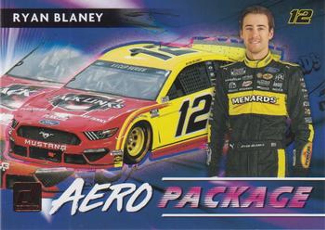 The Ryan Blaney 2021 Donruss NASCAR #AERO10 Aero Package Retail card is 1 of 113 Ryan Blaney's card variations in the 2021 Donruss NASCAR set being tracked by Sports Card Investor, including #74 Base, #12 Base, #40 Base, #197 Base, and #197 Carolina Blue.