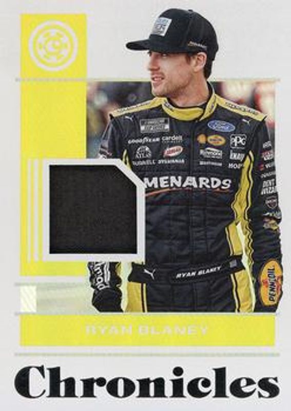 The Ryan Blaney 2022 Chronicles NASCAR #CS-RB Chronicles Swatches card is 1 of 124 Ryan Blaney's card variations in the 2022 Chronicles NASCAR set being tracked by Sports Card Investor, including Absolute, Clearly Donruss, Clear Vision, Crown Royale Silhouette Signatures, and Crusade.