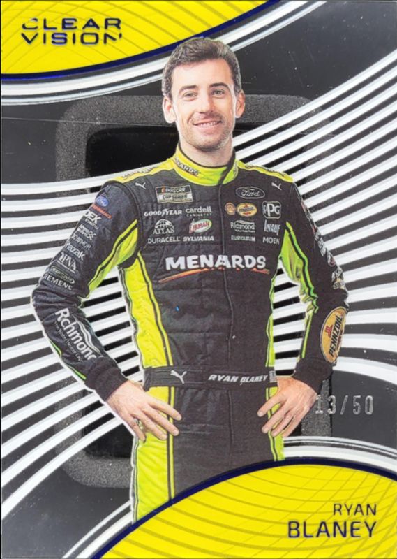 The Ryan Blaney 2023 Chronicles NASCAR #19 Clear Vision - Blue /50 card is 1 of 116 Ryan Blaney's card variations in the 2023 Chronicles NASCAR set being tracked by Sports Card Investor, including Chronicles Swatches, Clearly Donruss, Clear Vision, Elite Materials, and Luminance.