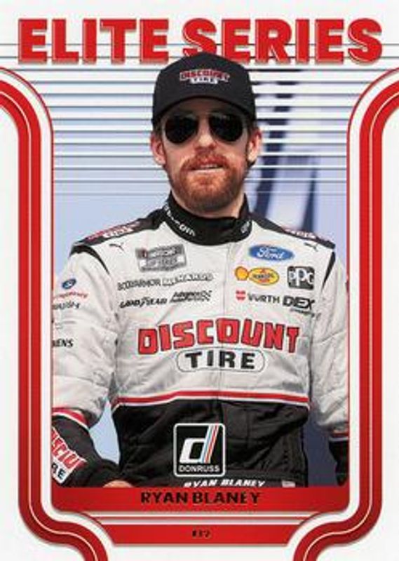 The Ryan Blaney 2023 Donruss NASCAR #E19 Elite Series Retail card is 1 of 104 Ryan Blaney's card variations in the 2023 Donruss NASCAR set being tracked by Sports Card Investor, including #133 Base, #17 Base, #49 Base, #133 Carolina Blue, and #17 Carolina Blue.