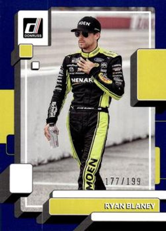 The Ryan Blaney 2023 Donruss NASCAR #49 Navy Blue /199 card is 1 of 104 Ryan Blaney's card variations in the 2023 Donruss NASCAR set being tracked by Sports Card Investor, including #133 Base, #17 Base, #49 Base, #133 Carolina Blue, and #17 Carolina Blue.