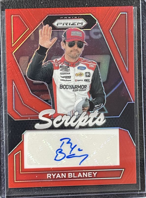 The Ryan Blaney 2024 Prizm NASCAR #S-RBY Scripts - Red /99 card is 1 of 88 Ryan Blaney's card variations in the 2024 Prizm NASCAR set being tracked by Sports Card Investor, including Base, Blue Ice, Green, Green Ice, and Red Ice.