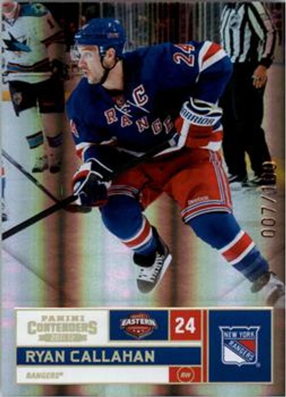 The Ryan Callahan 2011 Contenders #24 Gold /100 card is 1 of 7 Ryan Callahan's card variations in the 2011 Contenders set being tracked by Sports Card Investor, including Base /800, Black /1, Printing Plate Black /1, Printing Plate Cyan /1, and Printing Plate Magenta /1.