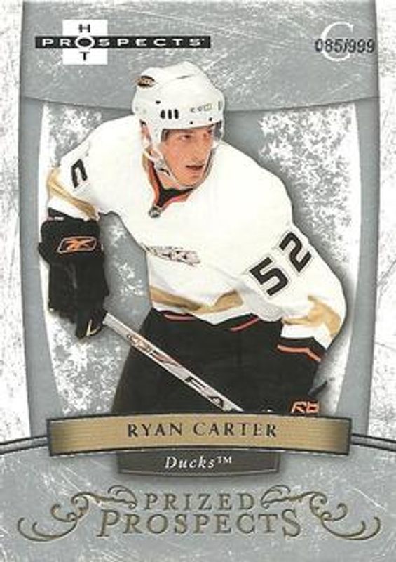 The Ryan Carter 2007 Fleer Hot Prospects #186 Base /399 Rookie card is 1 of 3 Ryan Carter's card variations in the 2007 Fleer Hot Prospects set being tracked by Sports Card Investor, including Red Hot /25, and White Hot /1.