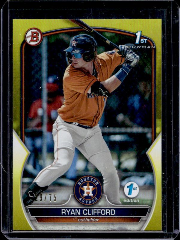 The Ryan Clifford 2023 Bowman 1st Edition #BPPF-10 Yellow Foil /75 card is 1 of 10 Ryan Clifford's card variations in the 2023 Bowman 1st Edition set being tracked by Sports Card Investor, including Base, Sky Blue Foil, Blue Foil /150, Gold Foil /50, and Orange Foil /25.