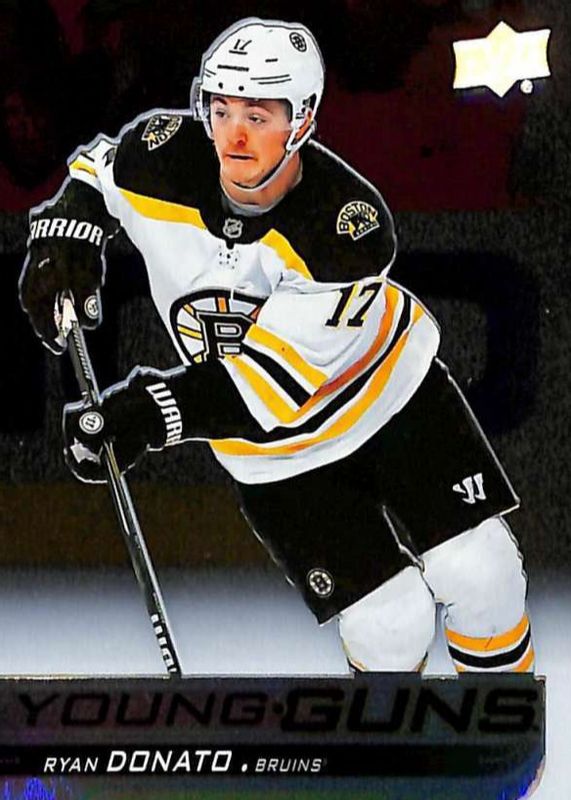 This card is 1 of 7 Ryan Donato's card variations in the 2018 Upper Deck set being tracked by Sports Card Investor, including Young Guns Base, Young Guns - Jumbo, Young Guns - Silver Foil, Young Guns - Speckled Rainbow Foil, and Young Guns - UD Exclusives /100.