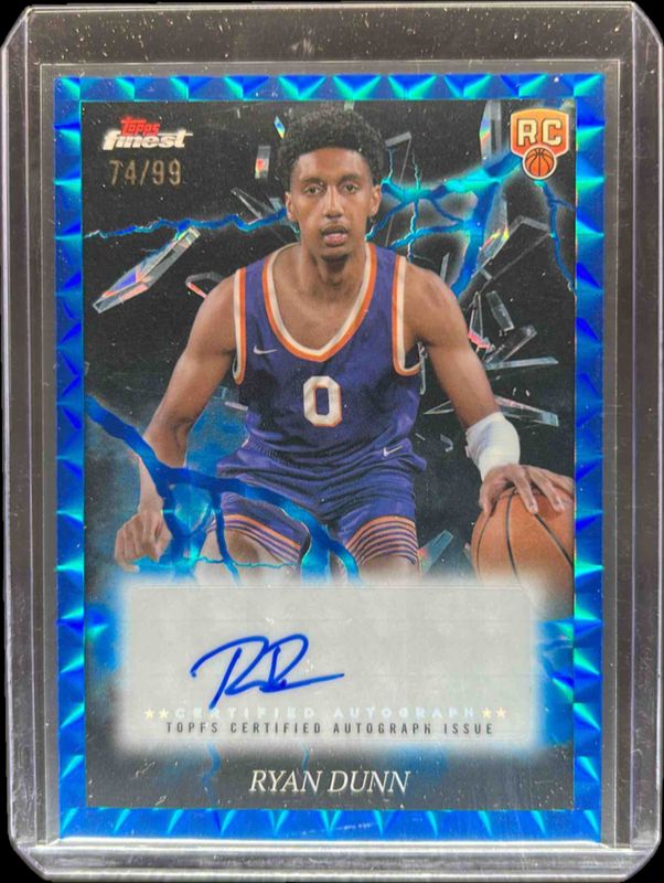 The Ryan Dunn 2024 Topps Finest #ES-RD Electrifying Signatures - Blue Geometric Refractor /99 Rookie card is 1 of 95 Ryan Dunn's card variations in the 2024 Topps Finest set being tracked by Sports Card Investor, including Arrivals, Arrivals - Geometric Refractor, Arrivals - Refractor, Arrivals - X-Fractor, and Base Uncommon.