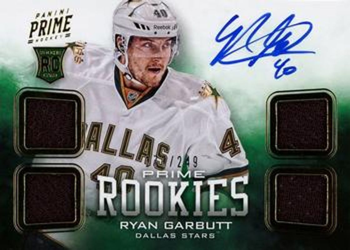 The Ryan Garbutt 2012 Prime #120 Base /249 Rookie card is 1 of 22 Ryan Garbutt's card variations in the 2012 Prime set being tracked by Sports Card Investor, including HoloSilver /50, HoloGold /25, Black /3, 2012 Panini Dominion /99, and Numbersakes Autographs /99.