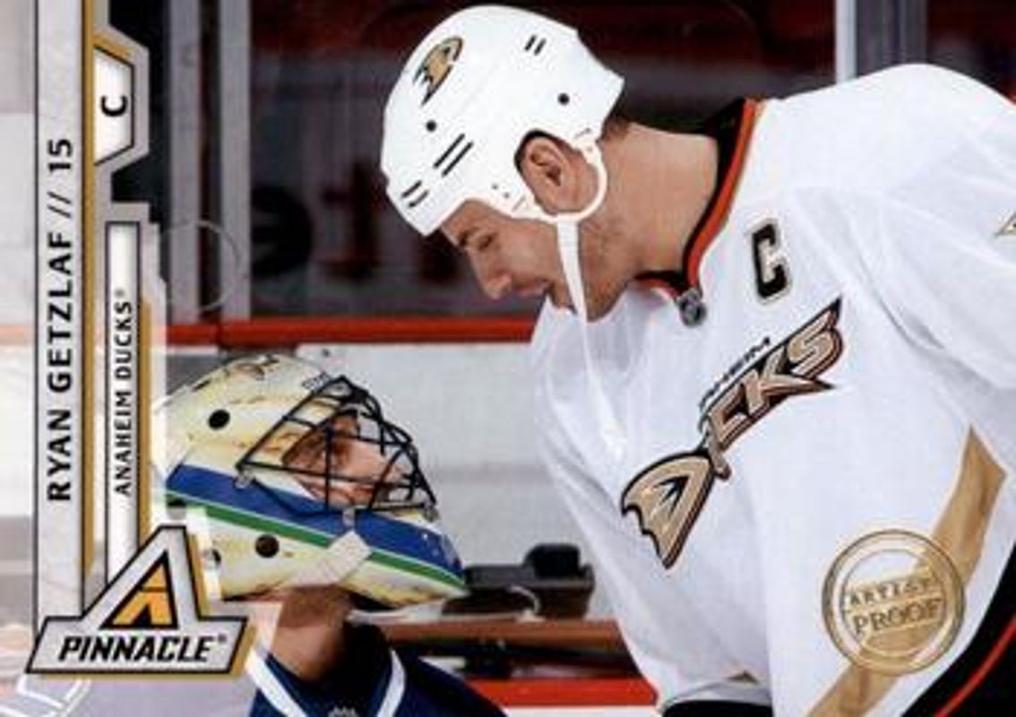 The Ryan Getzlaf 2010 Pinnacle #196 Artists Proofs card is 1 of 10 Ryan Getzlaf's card variations in the 2010 Pinnacle set being tracked by Sports Card Investor, including Base /299, Rink Collection, City Lights Materials /499, Threads /499, and Pencraft /100.