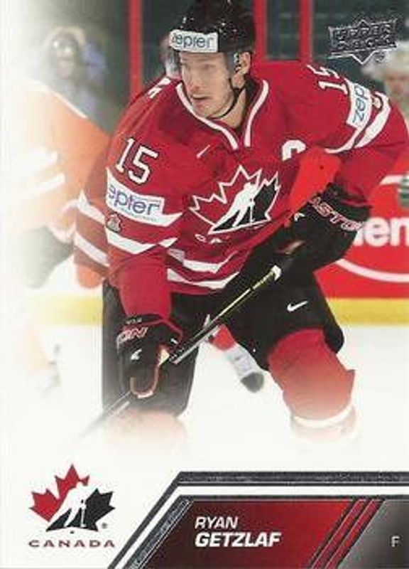 The Ryan Getzlaf 2013 Upper Deck Team Canada #76 Base card is 1 of 11 Ryan Getzlaf's card variations in the 2013 Upper Deck Team Canada set being tracked by Sports Card Investor, including Exclusive Red /100, High Gloss Gold /10, Printing Plates Black /1, Printing Plates Cyan /1, and Printing Plates Magenta /1.