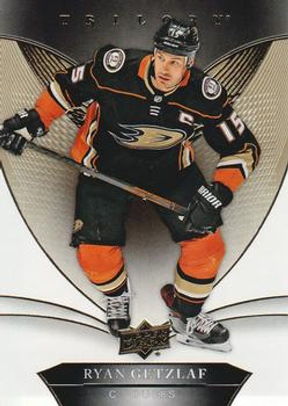The Ryan Getzlaf 2018 Upper Deck Trilogy #31 Base /399 card is 1 of 9 Ryan Getzlaf's card variations in the 2018 Upper Deck Trilogy set being tracked by Sports Card Investor, including Blue Foil /799, Red Foil /425, Green Foil /49, Black Foil /2, and Printing Plates Black /1.