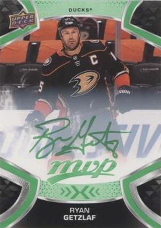 The Ryan Getzlaf 2021 Upper Deck MVP #15 Green Script card is 1 of 12 Ryan Getzlaf's card variations in the 2021 Upper Deck MVP set being tracked by Sports Card Investor, including Base, Blue, Gold Script, Ice Battles, and Silver Script.