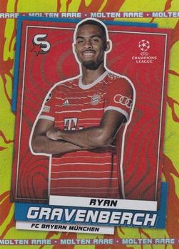 The Ryan Gravenberch 2022 Topps UEFA Superstars #99 Molten Rare card is 1 of 16 Ryan Gravenberch's card variations in the 2022 Topps UEFA Superstars set being tracked by Sports Card Investor, including #99 Base, #99 Common Yellow, #99b Common Yellow, #99 Fire & Ice Limited, and #99 Mystic.