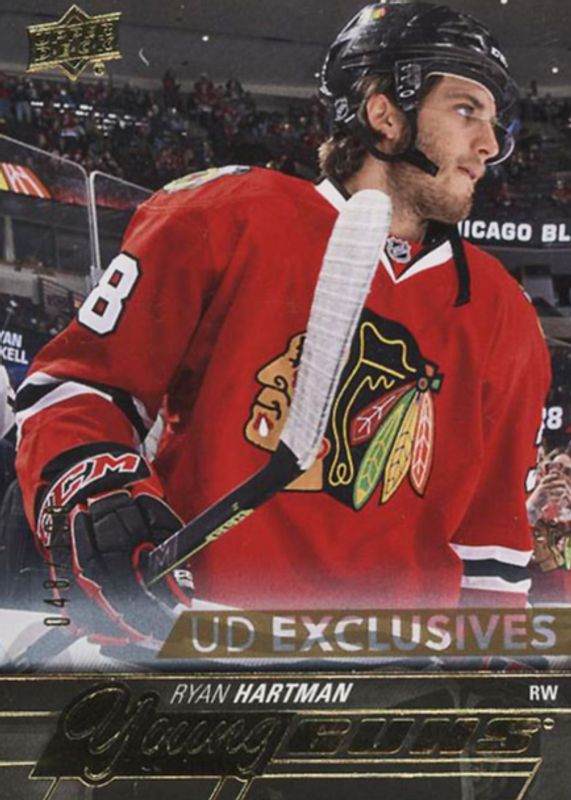 The Ryan Hartman 2015 Upper Deck #475 Young Guns - UD Exclusives /100 Rookie card in Raw condition has not changed in price in the last 30 days and was last sold for $3.25 .
