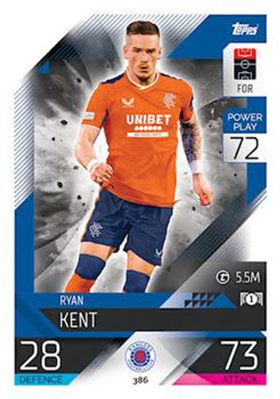 The Ryan Kent 2022 Topps Match Attax UEFA Champions League & UEFA Europa League #386 Base card is 1 of 5 Ryan Kent's card variations in the 2022 Topps Match Attax UEFA Champions League & UEFA Europa League set being tracked by Sports Card Investor, including 1st Edition, Crystal, Red Foil, and Limited Edition.