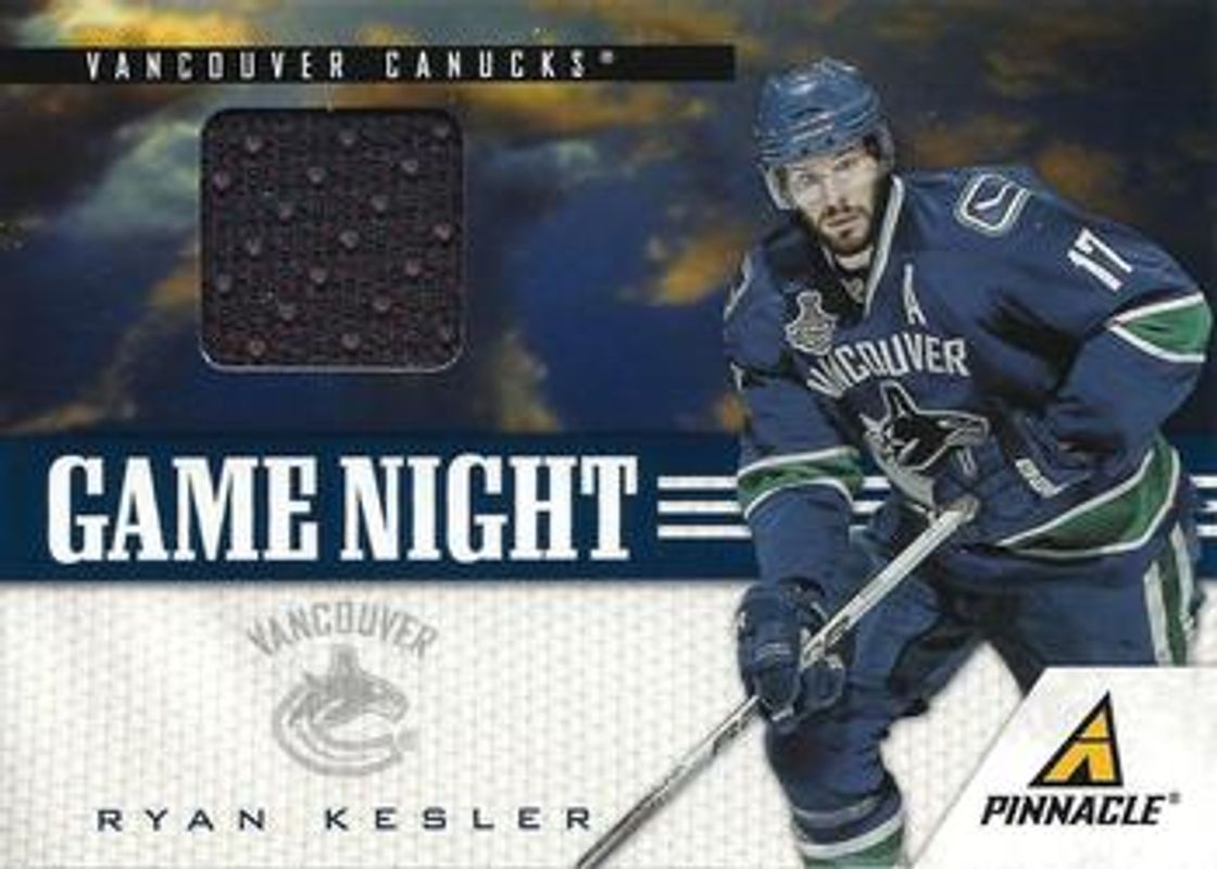 The Ryan Kesler 2011 Pinnacle #22 Game Night Materials card is 1 of 11 Ryan Kesler's card variations in the 2011 Pinnacle set being tracked by Sports Card Investor, including Base, Rink Collection, Printing Plate Black /1, Printing Plate Cyan /1, and Printing Plate Magenta /1.