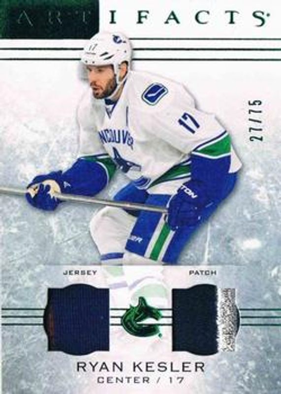 The Ryan Kesler 2014 Upper Deck Artifacts #80 Jersey Patch - Emerald /75 card is 1 of 14 Ryan Kesler's card variations in the 2014 Upper Deck Artifacts set being tracked by Sports Card Investor, including Base /999, Ruby /499, Emerald /99, Sapphire /85, and Gold Spectrum /25.