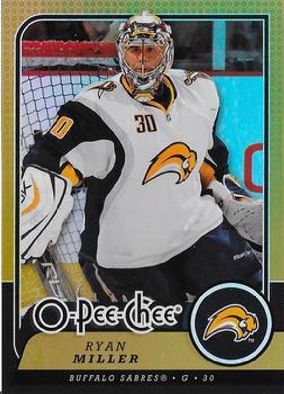 The Ryan Miller 2008 O-Pee-Chee #53 Gold card is 1 of 11 Ryan Miller's card variations in the 2008 O-Pee-Chee set being tracked by Sports Card Investor, including Base, 1979 Retro, 1979 Retro Blank Back, Metal, and Metal X.