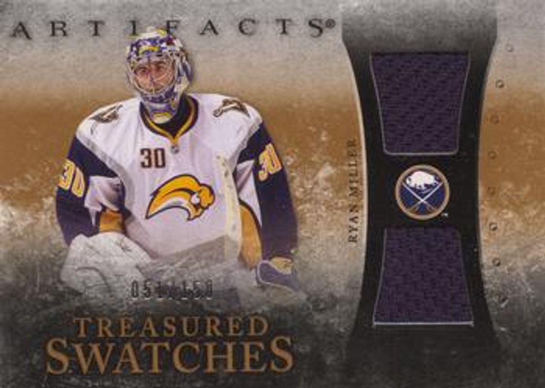 The Ryan Miller 2010 Upper Deck Artifacts #TS-RM Treasured Swatches /150 card is 1 of 39 Ryan Miller's card variations in the 2010 Upper Deck Artifacts set being tracked by Sports Card Investor, including #166 Base /699, #11 Base /699, #166 Emerald /50, #11 Emerald /50, and #166 Gold /35.