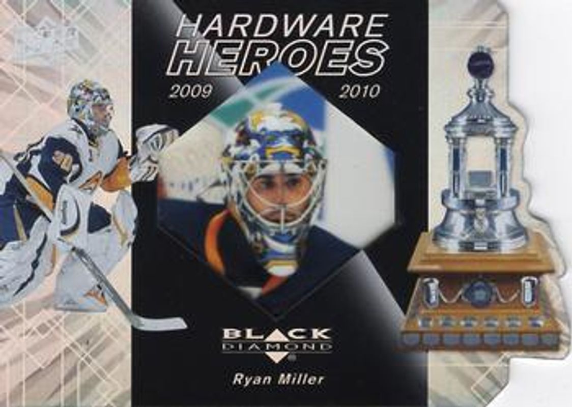The Ryan Miller 2010 Upper Deck Black Diamond #HH-RM Hardware Heroes /100 card is 1 of 11 Ryan Miller's card variations in the 2010 Upper Deck Black Diamond set being tracked by Sports Card Investor, including Base, Ruby /100, Gold /10, Platinum /1, and Jerseys Quad.